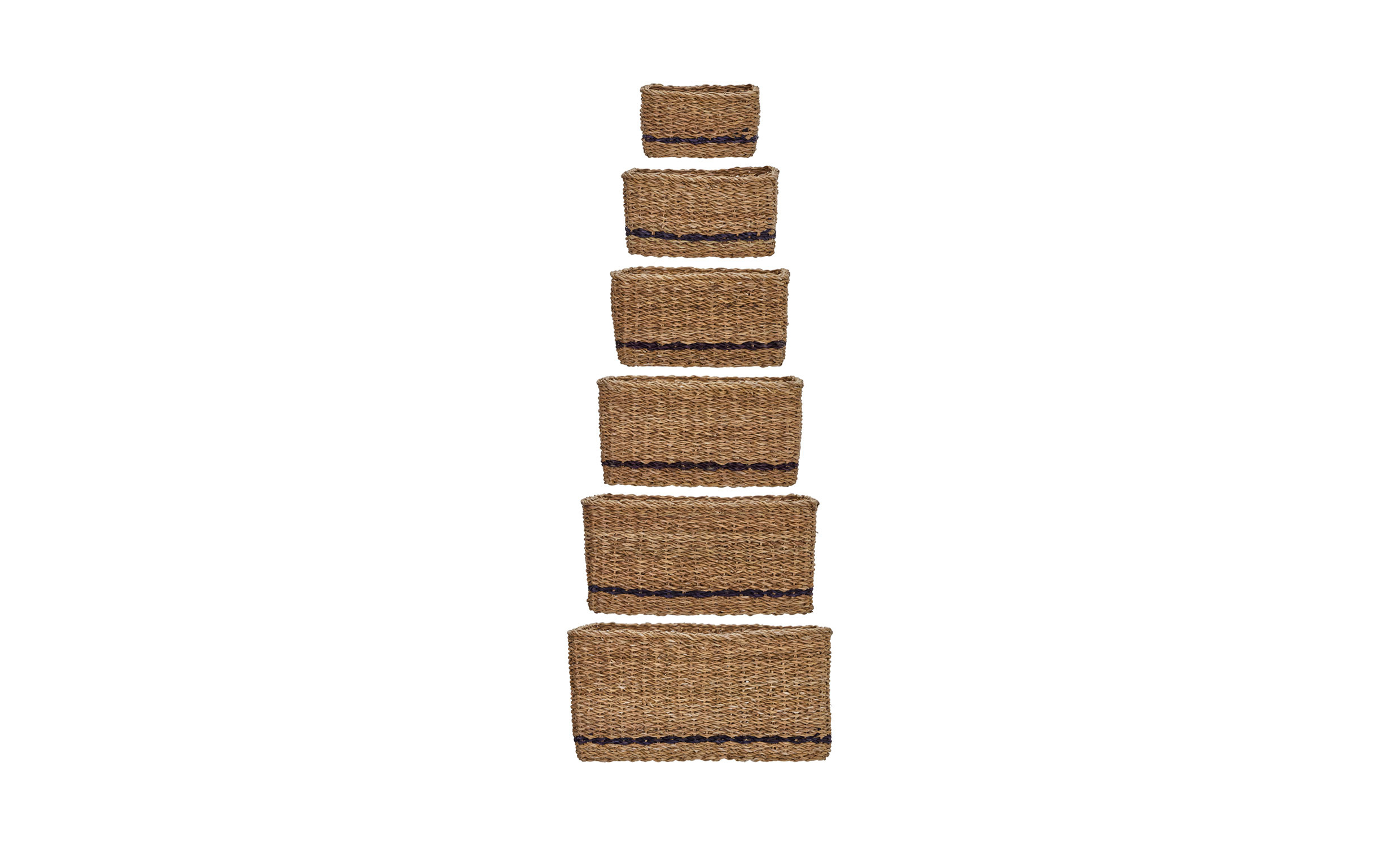 Set med sex handgjorda förvaringskorgar i naturligt sjögräs med diskret svart rand som tillför värme och personlighet till hemmet. Den fyrkantiga formen gör dem enkla att stapla eller placera på hyllor. Perfekta för stilfull förvaring i hall, vardagsrum, badrum eller kontor – organisera med ordning och låt korgarna bli en del av inredningen.