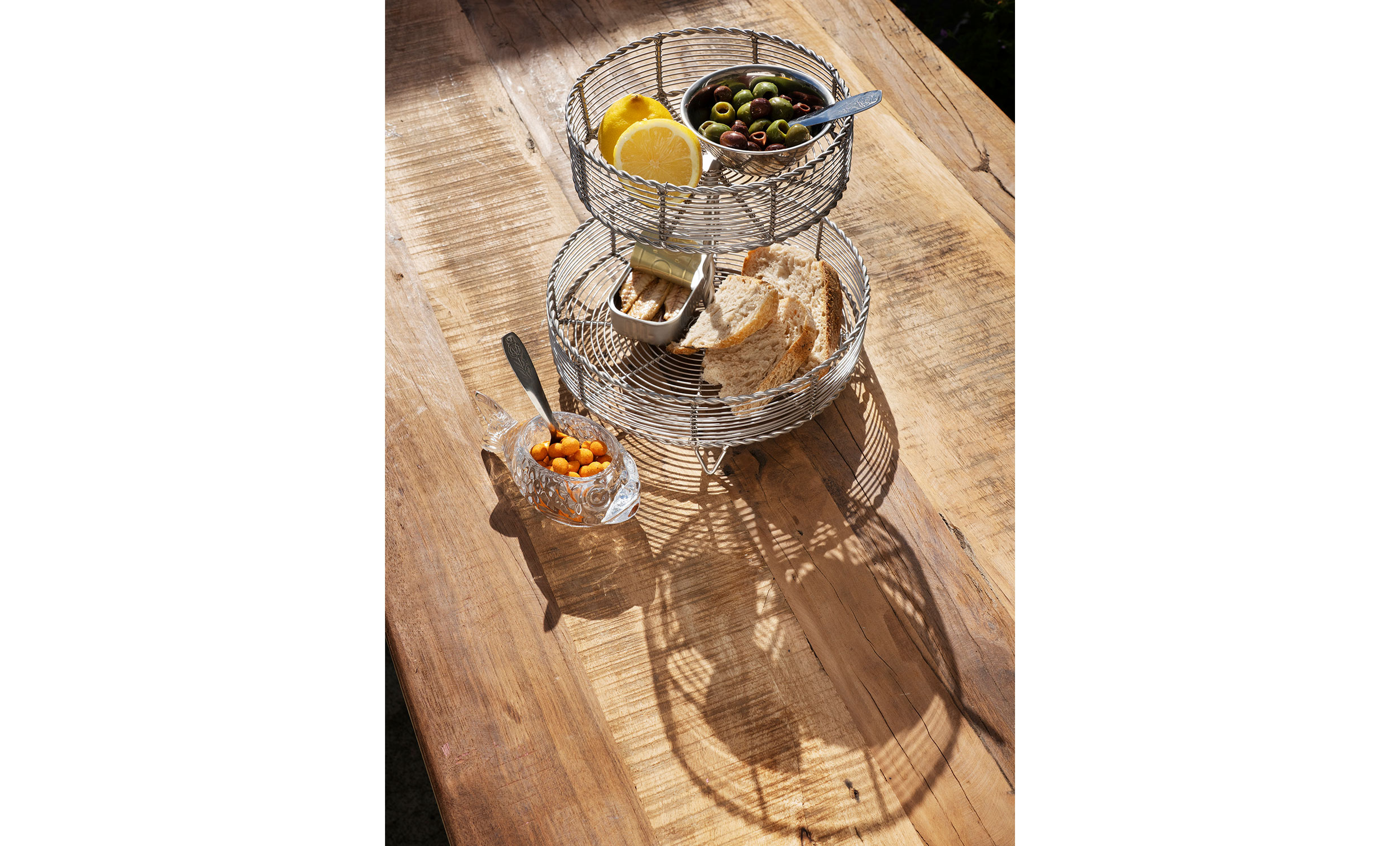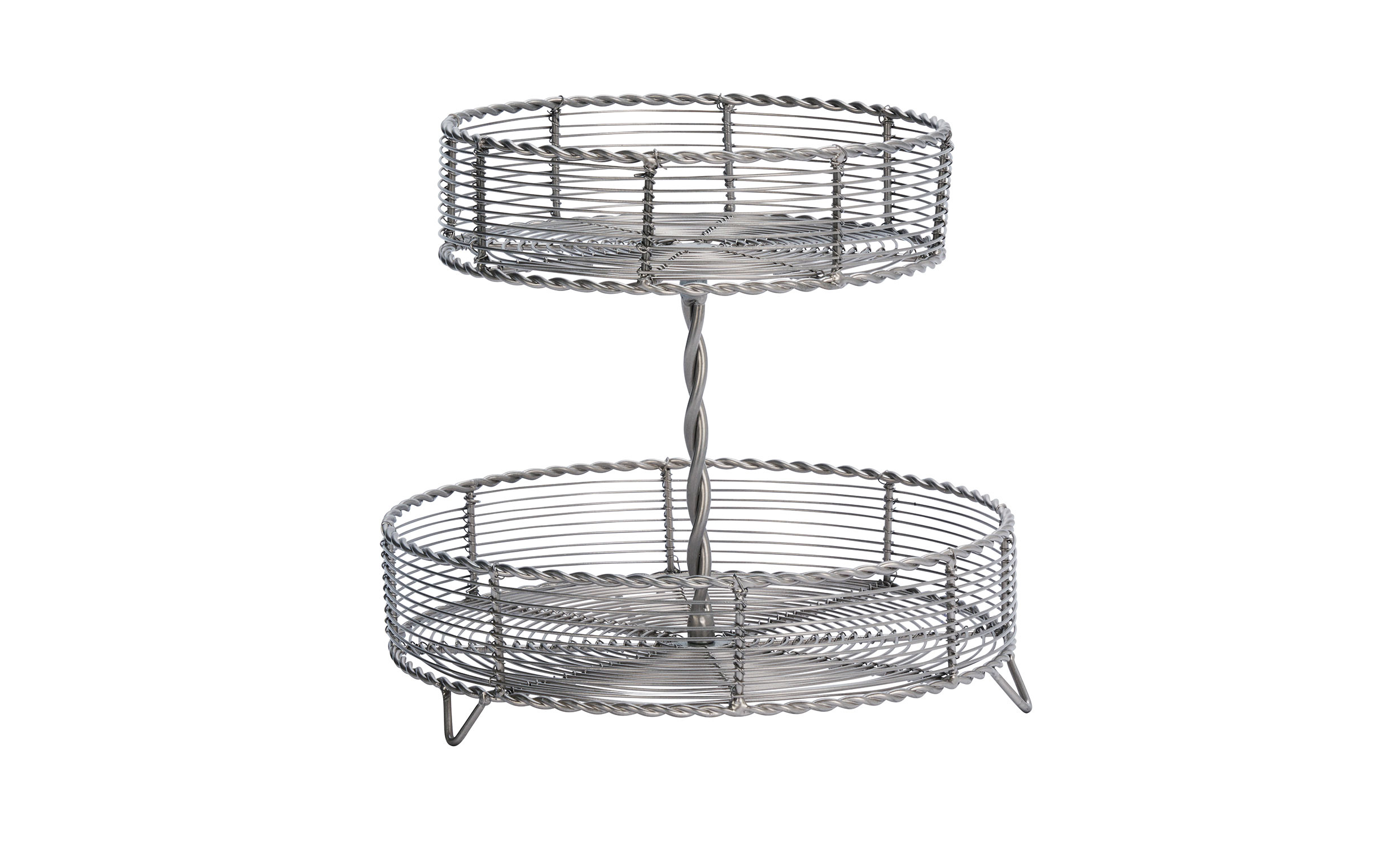 Detta praktiska våningsfat är tillverkad i stål med handlindad, tvinnad järntråd som ger en diskret rustik känsla. Den luftiga konstruktionen gör den perfekt för att exponera bakverk och drycker i café- eller butiksmiljö, men fungerar lika fint hemma för frukt, grönsaker eller annan förvaring i köket.