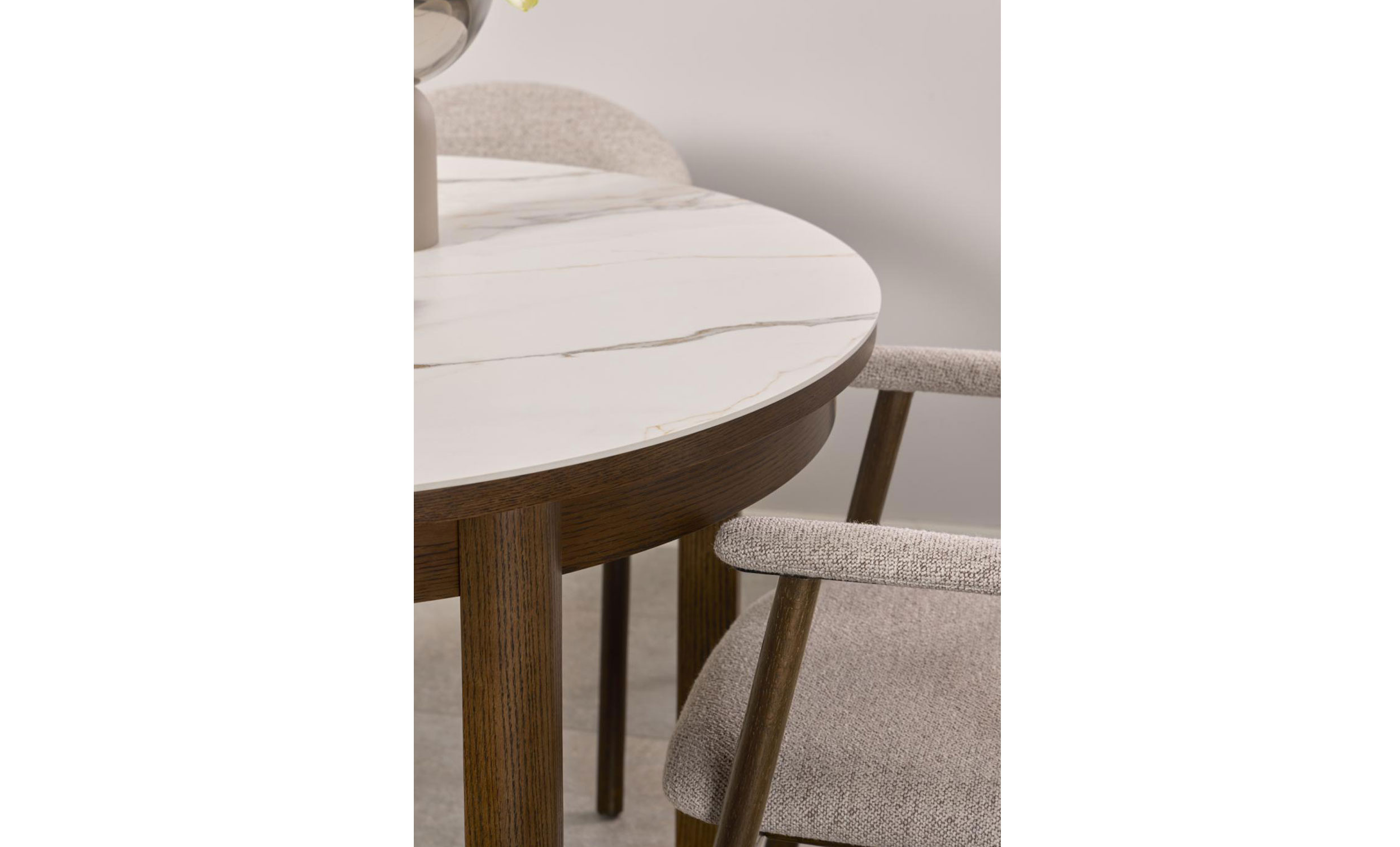 - Runt matbord med keramisk bordsskiva.