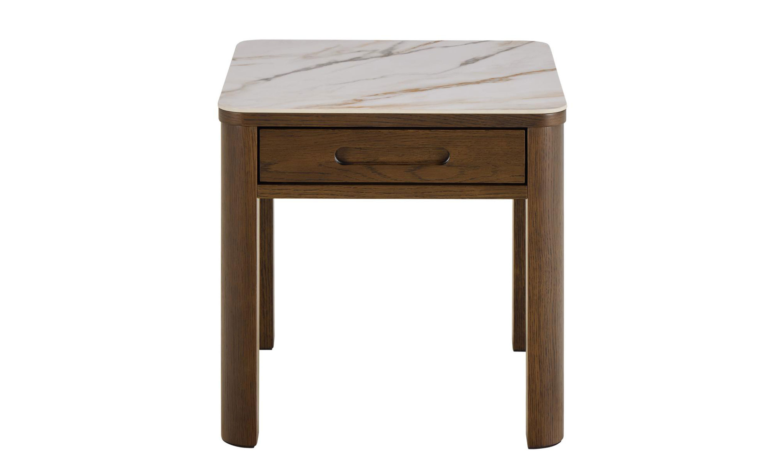 Veloria är ett kvadratiskt sidobord som kombinerar eleganta material med praktisk förvaring. Bordsskivan är tillverkad i polerad, krämfärgad keramik med diskreta ådringar som ger ett levande och exklusivt uttryck. Keramiken är både värme och reptålig vilket gör bordet slitstarkt och anpassat för daglig användning.