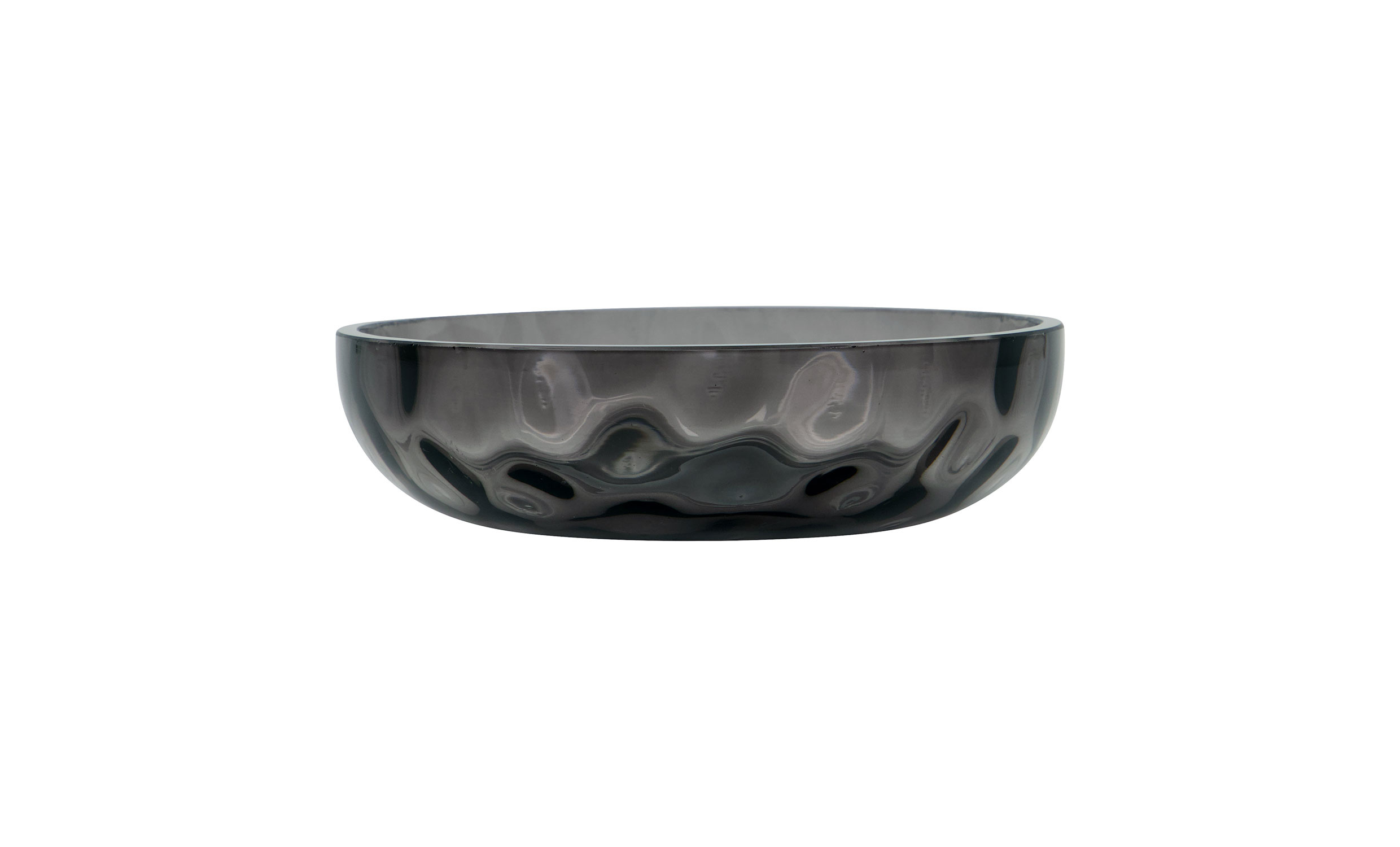 Wah tvålfat är tillverkat i gråtonat glas med dekorativa luftbubblor som ger varje exemplar ett unikt och levande uttryck. Den mjukt rundade, organiska formen skapar en lugn silhuett, medan det transparenta materialet ger subtila ljusreflektioner. En stilren badrumsdetalj som kombinerar funktion med modern elegans.