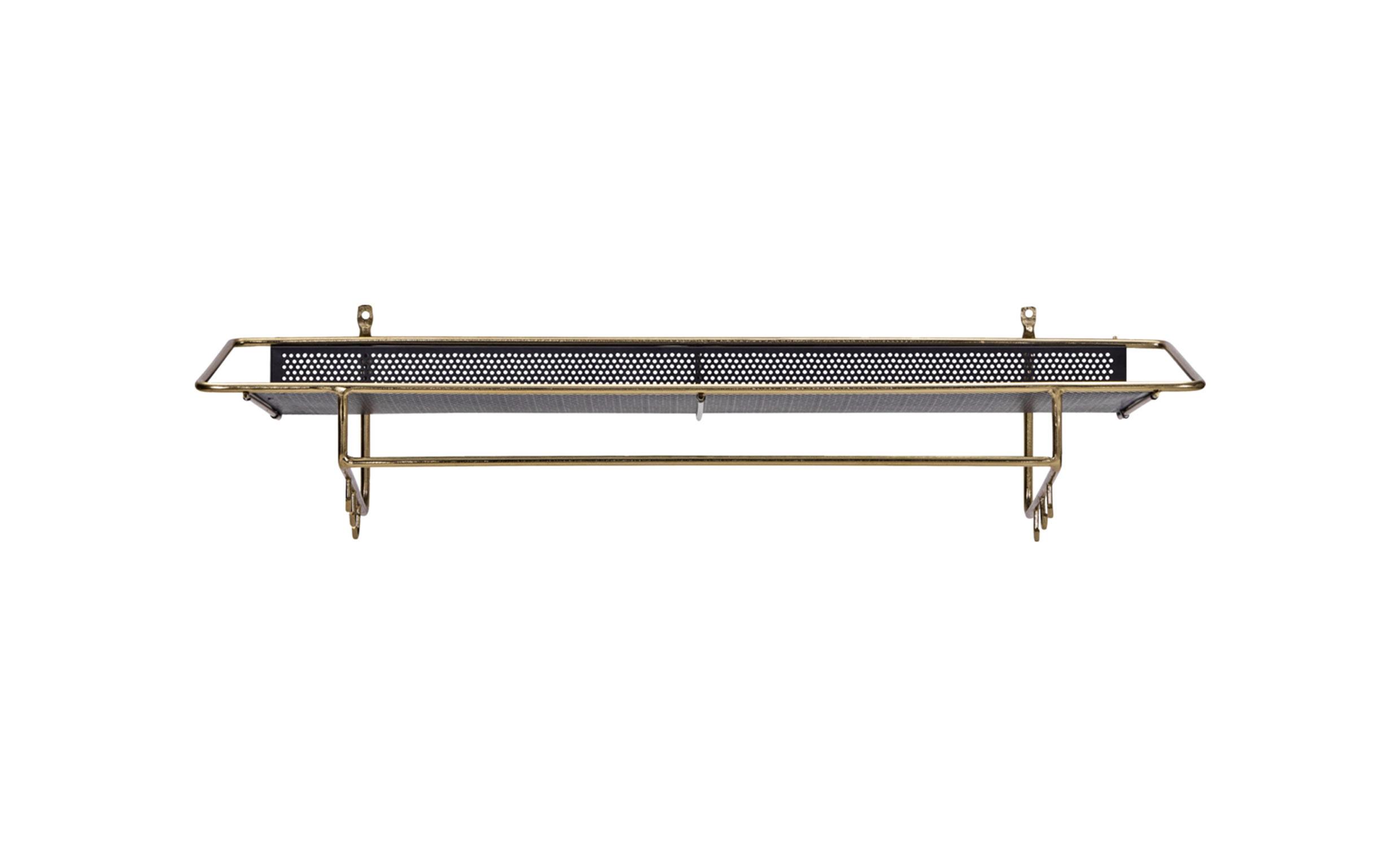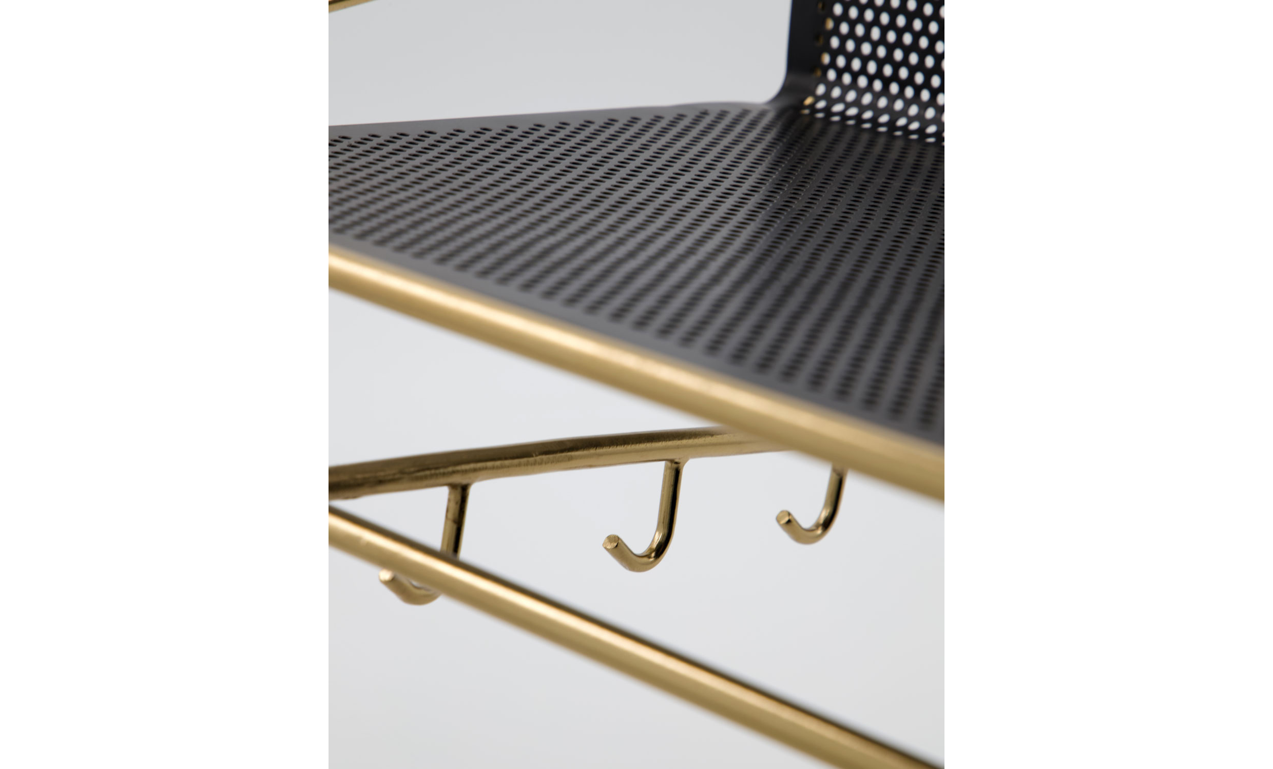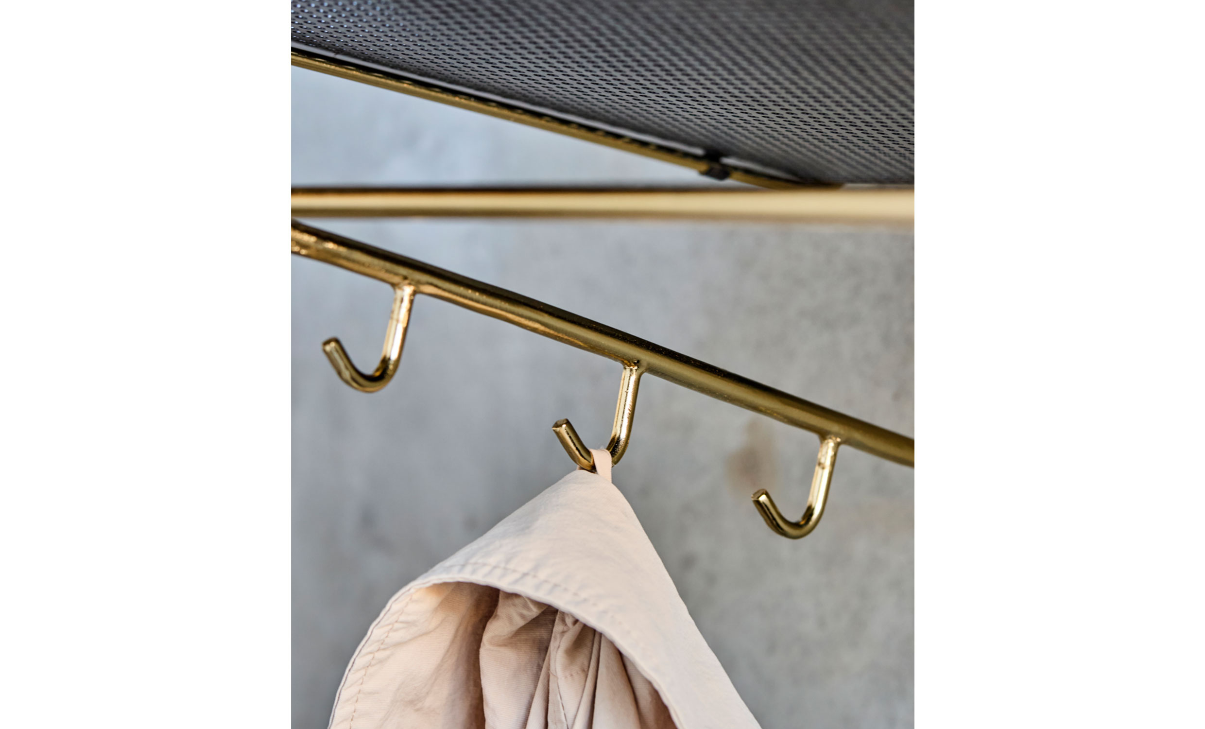 Elegant hylla i järn med antik mässingsfinish som tillför hallen eller garderoben tidlös karaktär. De rundade metallrören och den svarta, perforerade hyllan skapar ett luftigt uttryck. Med sex krokar och en stång under hyllan får du både stilfull och praktisk förvaring – perfekt i hall, sovrum eller kök.