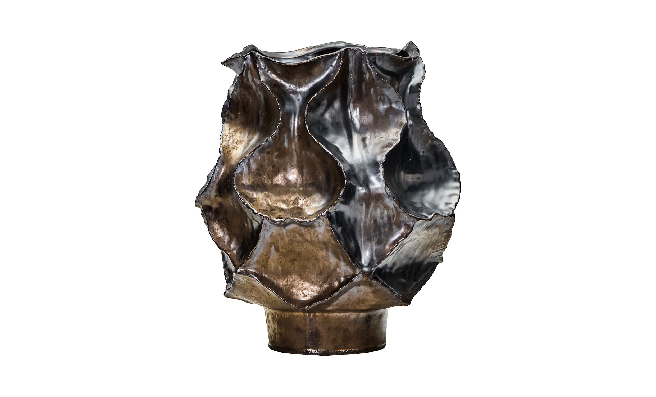 Denna handgjorda vas i stengods ger rummet ett starkt visuellt uttryck med sin antika metalliska glasyr och organiska, skulpturala form. Låt den stå för sig själv som ett dekorativt konstobjekt eller kombinera med grenar och blommor för att skapa ett personligt och levande arrangemang.