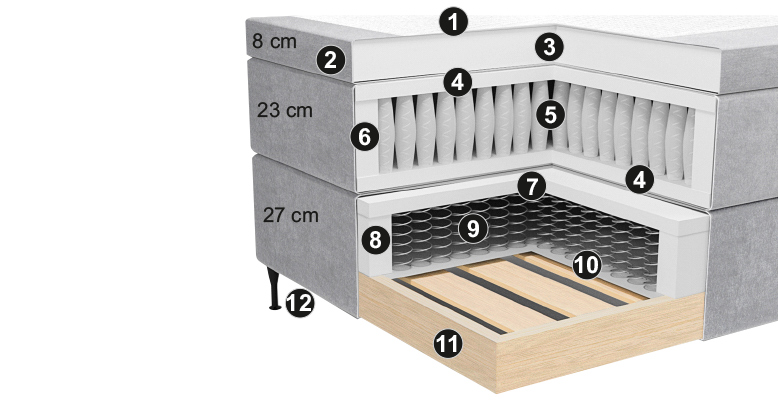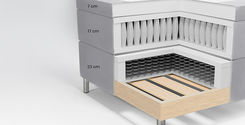 23 cm hög med 250 pocketfjädrar / m² som är indelade i 7 zoner för bättre komfort.